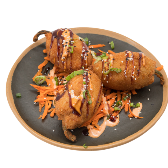 Breaded, deep fried, yellow peppers filled with imitation crab. Topped with Eel sauce drizzle and chopped green onions.